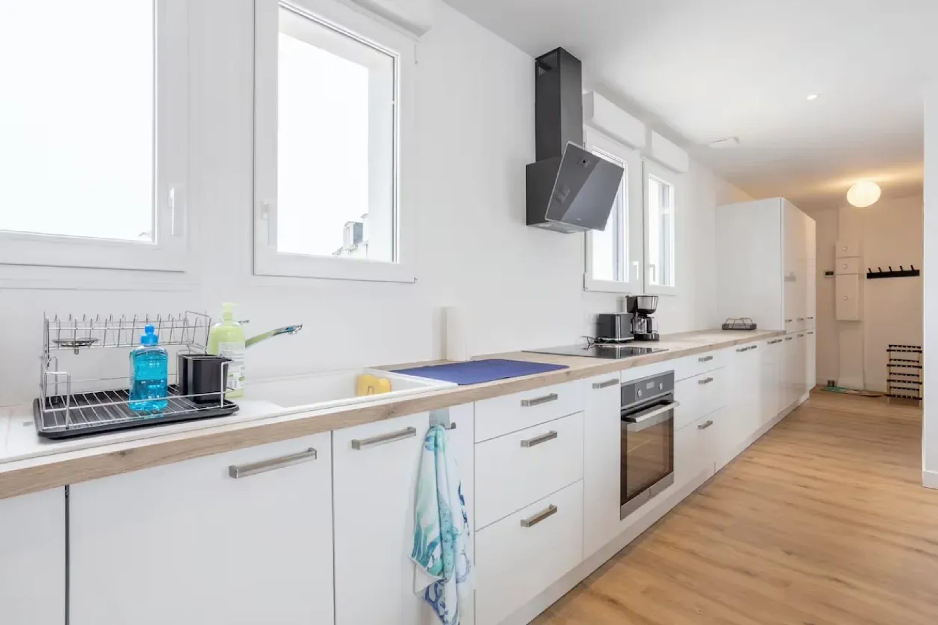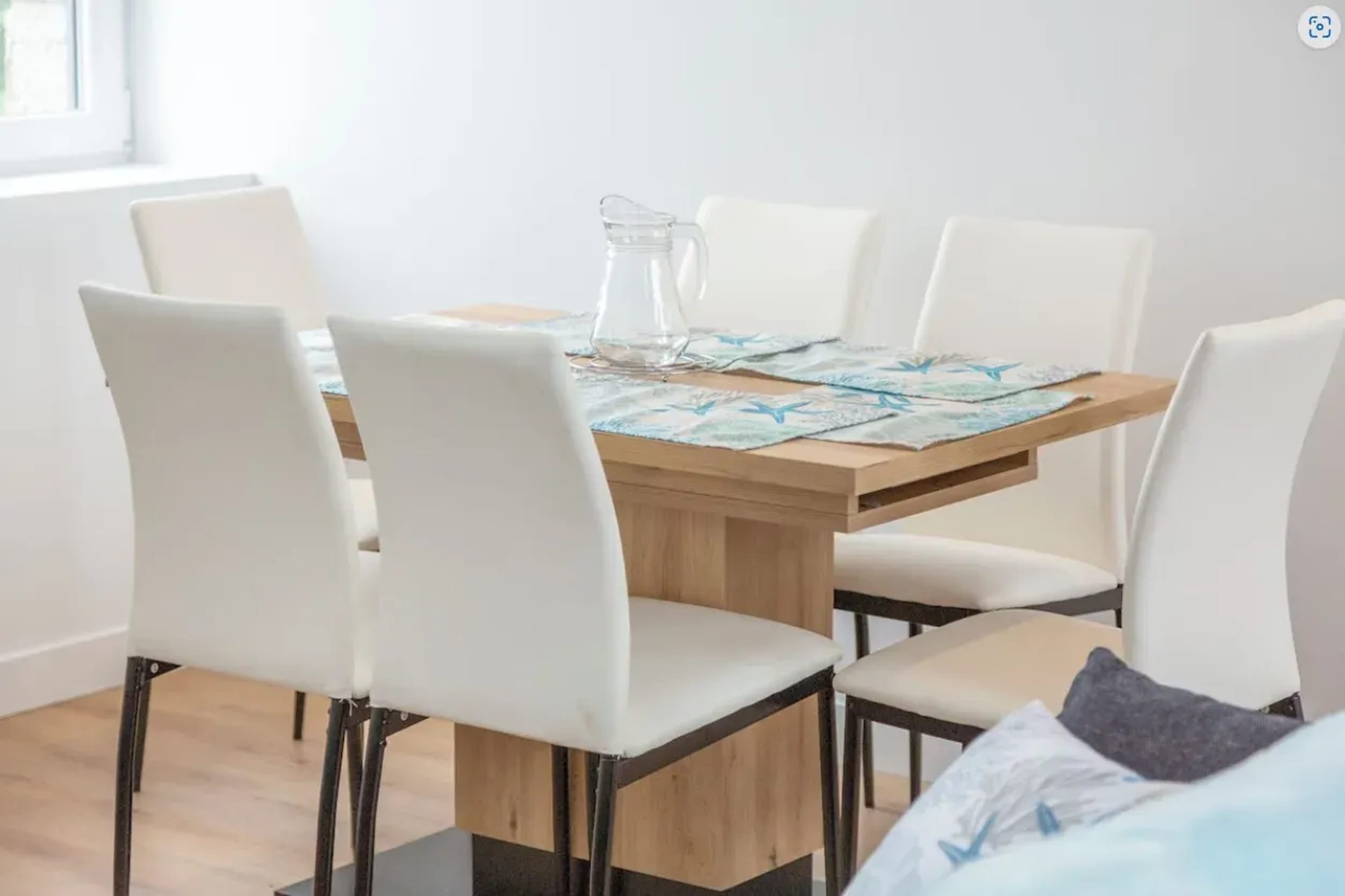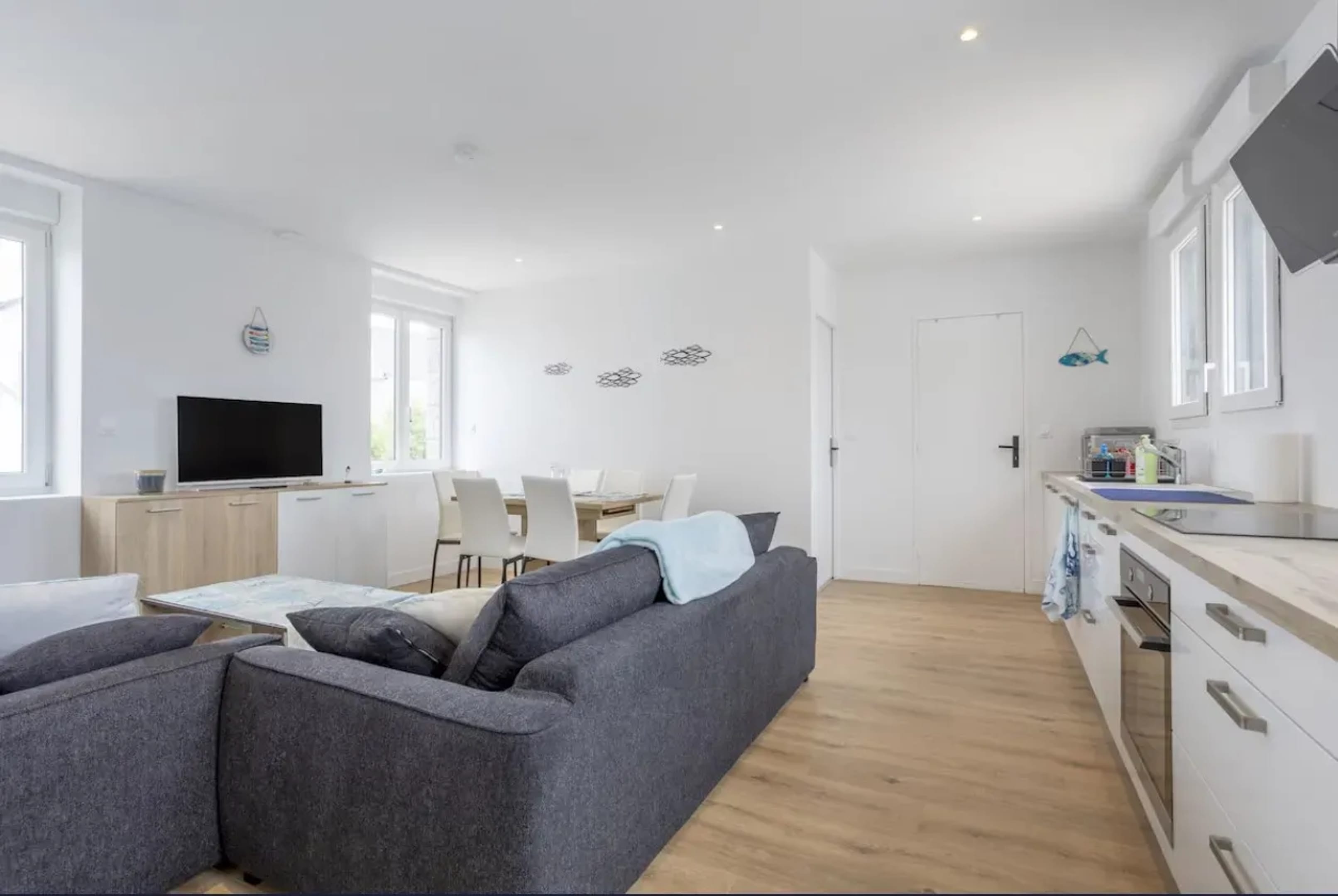 Le salon spacieux est l'endroit idéal pour se retrouver, agrémenté d'un confortable canapé pour des soirées cinéma en famille. La cuisine entièrement équipée offre tout le nécessaire pour préparer de bons repas, avec une table de repas accueillante pour des moments conviviaux. L’ambiance chaleureuse de cet espace commun saura vous séduire.